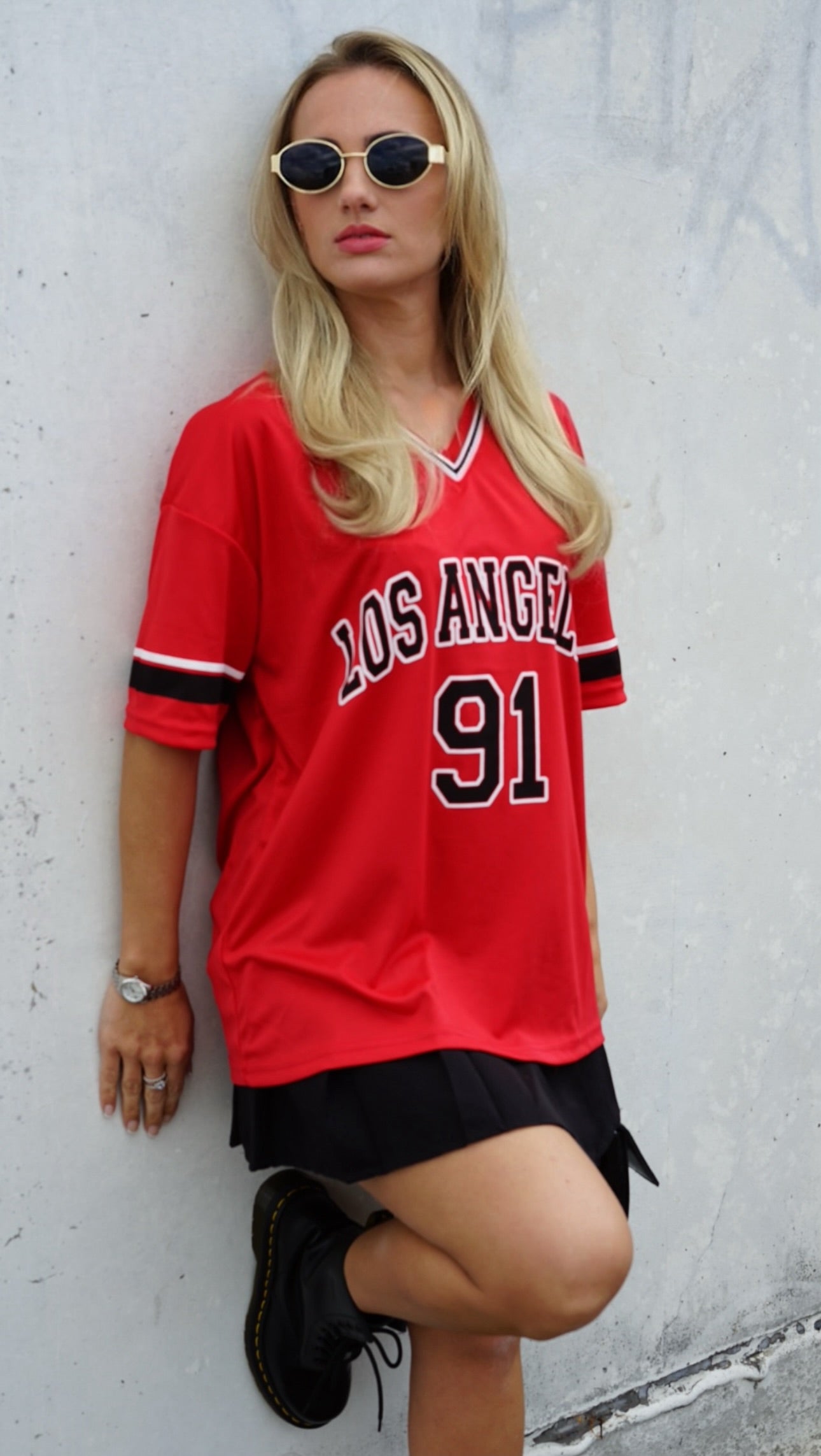 RED CONTRAST SHORT SLEEVE LA VARSITY T-SHIRT
